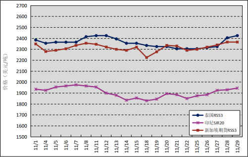 国外主产区:11月,泰国RSS3平均价格为2361美元/吨,环比下跌354美元/吨,最高价为2425美元/吨,最低价为2305美元/吨;印尼SIR20平均价格为1905美元/吨,环比下跌51美元/吨,最高价为1975美元/吨,最低价为1830美元/吨;新加坡RSS3期货主力合约月均结算价格为2316美元/吨,环比下跌261美元/吨,最高价为2366美元/吨,最低价为2225美元/吨。