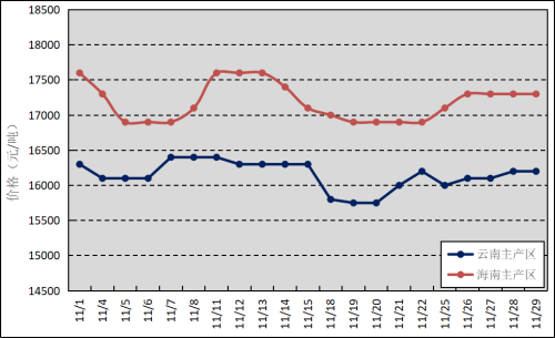 国内主产区:11月,云南大部分产区月底停割,海南产区正常开展割胶。云南、海南鲜胶乳(折干胶)月均价格分别为16148元/吨、17186元/吨,环比下跌496元/吨、1464元/吨。