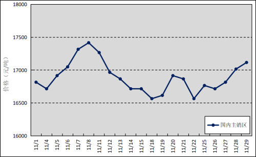 国内主销区:11月,上海、青岛和天津等销区市场的国产全乳标准胶平均价格为16892元/吨,环比下跌209元/吨,最高价为17417元/吨,最低价为16567元/吨。
