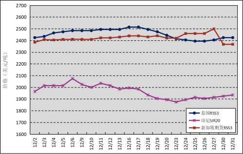 国外主产区:12月,泰国RSS3平均价格为2457美元/吨,环比上涨96美元/吨,最高价为2515美元/吨,最低价为2395美元/吨;印尼SIR20平均价格为1965美元/吨,环比上涨60美元/吨,最高价为2075美元/吨,最低价为1875美元/吨;新加坡RSS3期货主力合约月均结算价格为2424美元/吨,环比上涨108美元/吨,最高价为2500美元/吨,最低价为2368美元/吨。