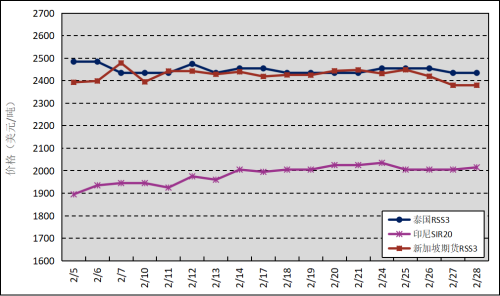 国外主产区:2月,泰国RSS3平均价格为2448美元/吨,环比上涨21美元/吨,最高价为2485美元/吨,最低价为2435美元/吨;印尼SIR20平均价格为1984美元/吨,环比上涨81美元/吨,最高价为2035美元/吨,最低价为1895美元/吨;新加坡RSS3期货主力合约月均结算价格为2425美元/吨,环比上涨35美元/吨,最高价为2479美元/吨,最低价为2380美元/吨。