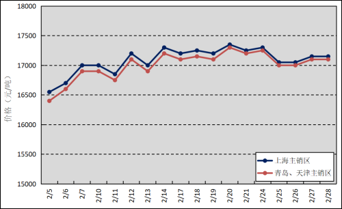 国内主销区:2月,国产全乳标准胶上海市场平均价格17086元/吨,环比上涨586元/吨,最高价为17350元/吨,最低价为16550元/吨;青岛市场和天津市场平均价格17003元/吨,环比上涨617元/吨,最高价为17300元/吨,最低价为16400元/吨。